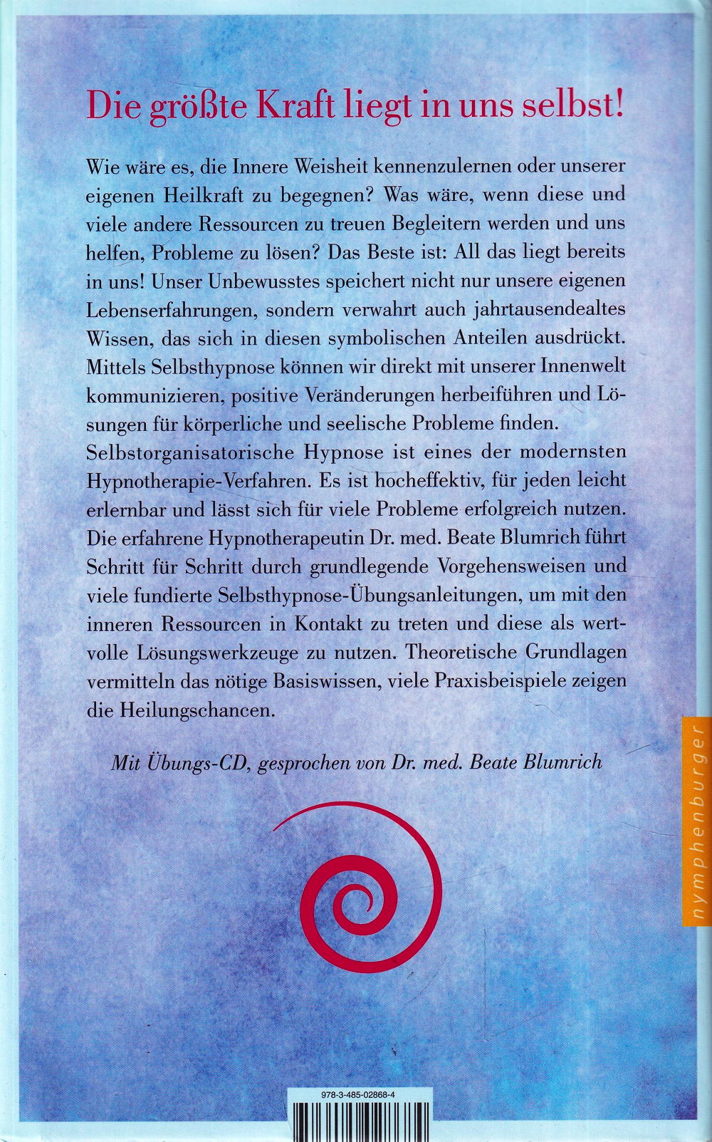 Alle Erfahrungen sind dort gespeichert: Mittels Selbsthypnose können wir direkt mit unserem Unbewussten kommunizieren, um im Zugriff auf unsere Wesensprinzipien Lösungen körperlicher und seelischer Probleme zu finden. Selbstorganisatorische Hypnose ist dabei eines der modernsten Hypnotherapie-Verfahren, hocheffektiv und für jeden leicht nutzbar. Die erfahrene Hypnosetherapeutin Dr. med. Beate Blumrich führt Schritt für Schritt durch fundierte Übungsanleitungen, um mit den eigenen Ressourcen in Kontakt zu treten und diese als wertvolle Lösungswerkzeuge zu nutzen. Theoretische Grundlagen vermitteln das nötige Basiswissen, viele Praxisbeispiele zeigen die Heilungschancen.