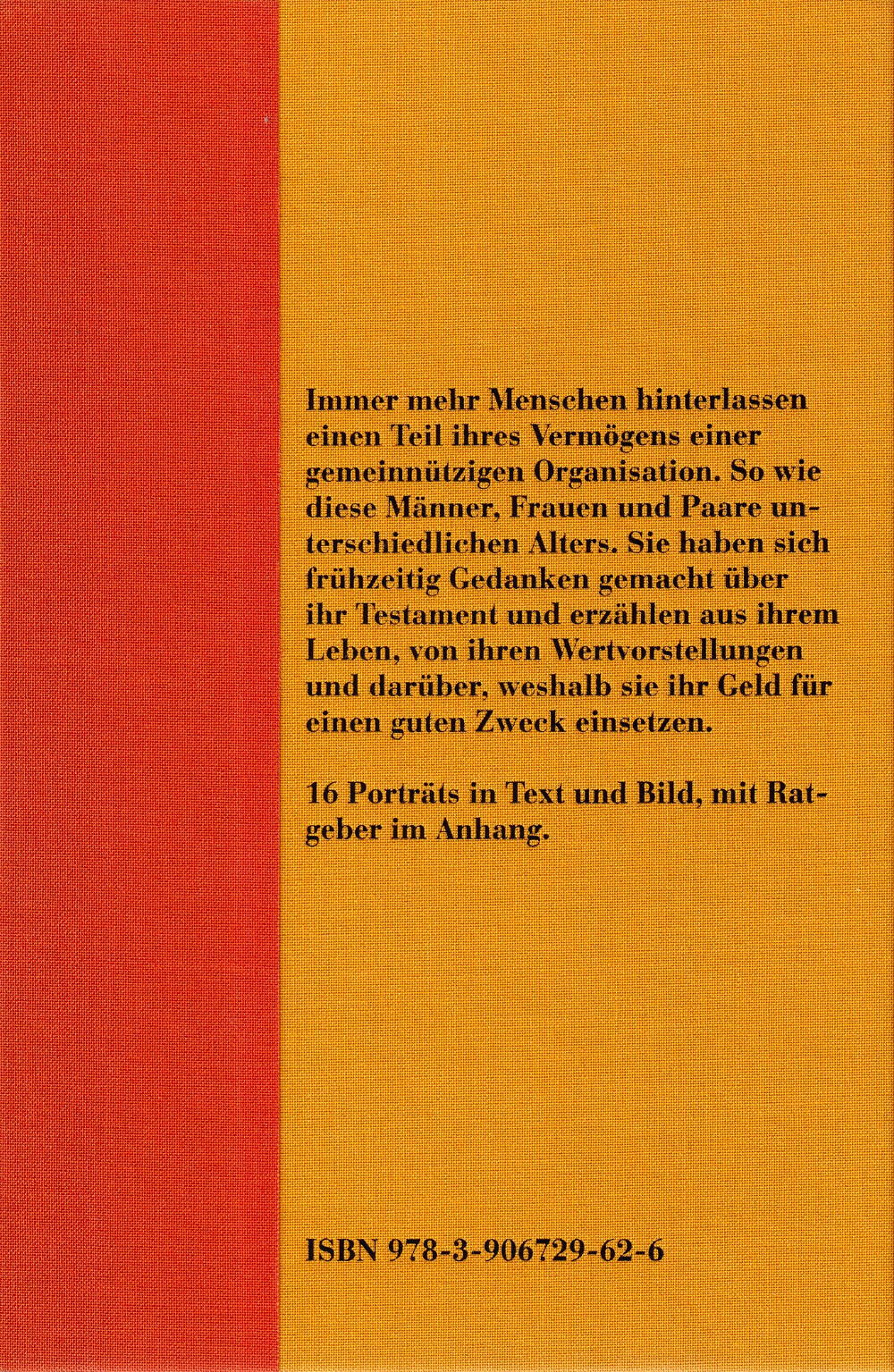 Da ist zum Beispiel der bekannte Galerist, die umweltengagierte Siebzigjährige, das kinderlose Ärztepaar oder die junge Familie aus dem Bergkanton. Sie und zwölf weitere Personen erzählen über ihr Leben und ihre Beweggründe, eine gemeinnützige Organisation in ihrem Testament zu berücksichtigen.