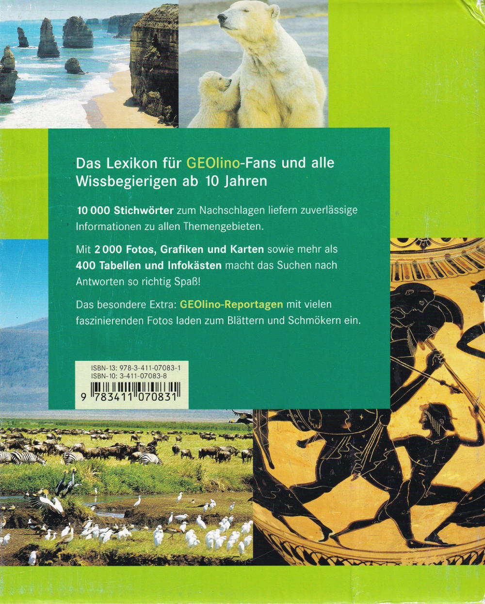 Dieses zweibändige Lexikon ist das ideale Nachschlagewerk für GEOlino-Fans und alle Wissbegierigen ab 10 Jahren. 10 000 Stichwörter liefern zuverlässige Informationen zu allen Themengebieten.Mit 2 000 Fotos, Grafiken und Karten sowie mehr als 400 Tabellen und Infokästen macht das Suchen nach Antworten so richtig Spass! Als besonderes Extra laden spannend aufbereitete GEOlino-Beiträge mit brillanten Fotos zum Blättern und Schmökern ein. Die doppelseitigen Beiträge widmen sich faszinierenden Themen wie z.B. James Cook, Diamanten, Pandas oder Troja.