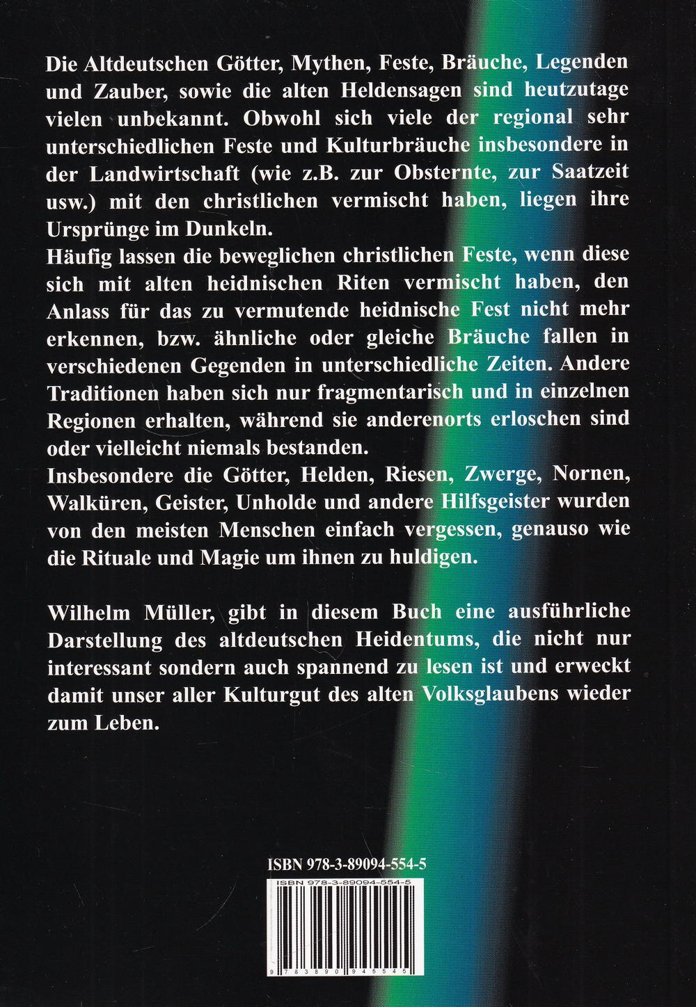 Die Altdeutschen Götter, Mythen, Feste, Bräuche, Legenden und Zauber, sowie die alten Heldensagen sind heutzutage vielen unbekannt. Obwohl sich viele der regional sehr unterschiedlichen Feste und Kulturbräuche insbesondere in der Landwirtschaft (wie z.B. zur Obsternte, zur Saatzeit usw.) mit den christlichen vermischt haben, liegen ihre Ursprünge im Dunkeln. Häufig lassen die beweglichen christlichen Feste, wenn diese sich mit alten heidnischen Riten vermischt haben, den Anlass für das zu vermutende heidnische Fest nicht mehr erkennen, bzw. ähnliche oder gleiche Bräuche fallen in verschiedenen Gegenden in unterschiedliche Zeiten. Andere Traditionen haben sich nur fragmentarisch und in einzelnen Regionen erhalten, während sie anderenorts erloschen sind oder vielleicht niemals bestanden. Insbesondere die Götter, Helden, Riesen, Zwerge, Nornen, Walküren, Geister, Unholde und andere Hilfsgeister wurden von den meisten Menschen einfach vergessen, genauso wie die Rituale und Magie um ihnen zu huldigen. Wilhelm Müller, gibt in diesem Buch eine ausführliche Darstellung des altdeutschen Heidentums, die nicht nur interessant sondern auch spannend zu lesen ist und erweckt damit unser aller Kulturgut des alten Volksglaubens wieder zum Leben.