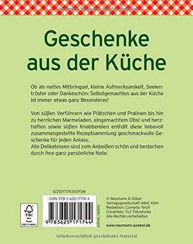 Ob als Mitbringsel, kleine Aufmerksamkeit, Seelentröster oder Dankeschön: Selbstgemachtes aus der Küche ist immer etwas ganz Besonderes! Von süssen Verführern wie Plätzchen und Pralinen bis hin zu herrlichen Marmeladen, eingemachtem Obst und herzhaften Knabbereien enthält diese liebevoll zusammengestellte Rezeptsammlung geschmackvolle Geschenke für jeden Anlass.