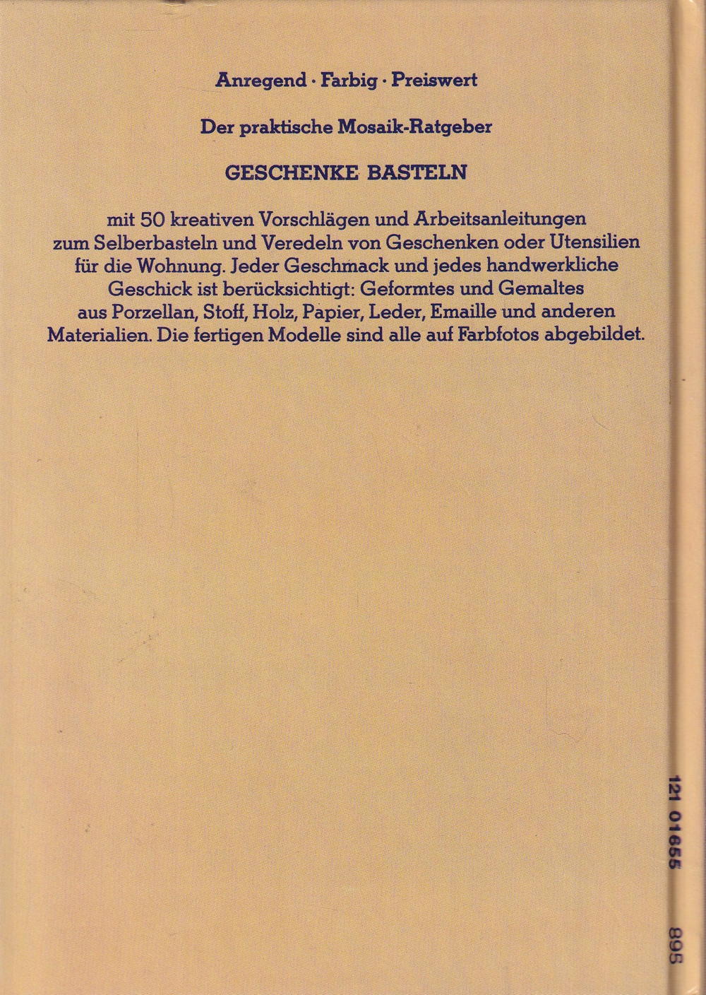 Mit 50 kreativen Vorschlägen und Arbeitsanleitungen zum Selberbasteln und Veredeln von Geschenken oder Utensilien für die Wohnung. Jeder Geschmack und jedes handwerkliche Geschick ist berücksichtigt: Geformtes und Gemaltes aus Porzellan, Stoff, Holz, Papier, Leder, Emaille und anderen Materialien. Die fertigen Modelle sind alle auf Farbfotos abgebildet.