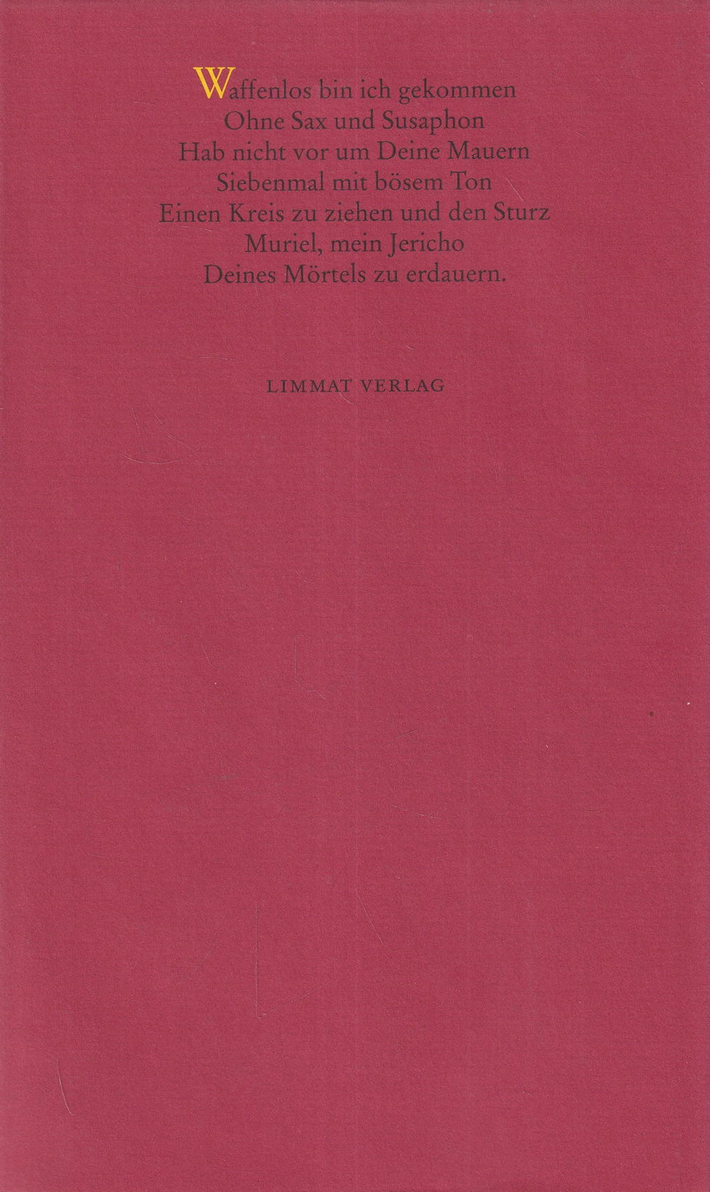 Waffenlos bin ich gekommen Ohne Sax und Susaphon Hab nicht vor um Deine Mauern Siebenmal mit bösem Ton Einen Kreis zu ziehen und den Sturz Muriel, mein Jericho Deines Mörtels zu erdauern.