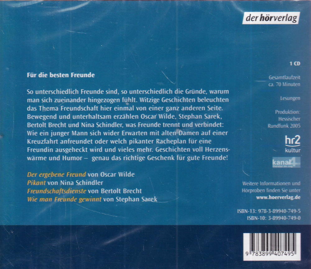 Bewegend und unterhaltsam erzählen Oscar Wilde, Stephan Sarek, Bertolt Brecht und Nina Schindler, was Freunde trennt und verbindet: Wie ein junger Mann sich wider Erwarten mit alten Damen auf einer Kreuzfahrt anfreundet oder welch pikanter Racheplan für eine Freundin ausgeheckt wird und vieles mehr. Geschichten voll Herzenswärme und Humor - genau das richtige Geschenk für gute Freunde!