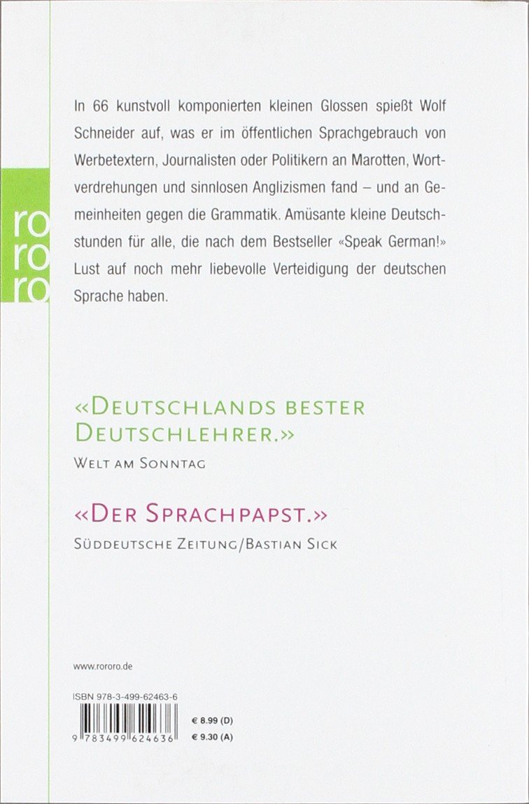 In 66 kunstvoll komponierten kleinen Glossen spiesst Wolf Schneider auf, was er im öffentlichen Sprachgebrauch von Werbetextern, Journalisten oder Politikern an Marotten, Wortverdrehungen und sinnlosen Anglizismen fand - und an Gemeinheiten gegen die Grammatik. Amüsante kleine Deutschstunden für alle, die nach dem Bestseller "Speak German!" Lust auf noch mehr liebevolle Verteidigung der deutschen Sprache haben.