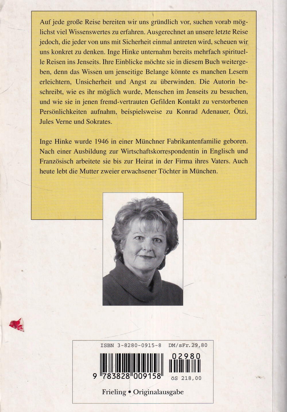 Auf jede grosse Reise bereiten wir uns gründlich vor, suchen vorab möglichst viel Wissenswertes zu erfahren. Ausgerechnet an unsere letzte Reise jedoch, die jeder von uns mit Sicherheit einmal antreten wird, scheuen wir uns konkret zu denken. Inge Hinke unternahm bereits mehrfach spirituelle Reisen ins Jenseits. Ihre Einblicke möchte sie in diesem Buch weitergeben, denn das Wissen um jenseitige Belange könnte es manchen Lesern erleichtern, Unsicherheit und Angst zu überwinden. Die Autorin beschreibt, wie es ihr möglich wurde, Menschen im Jenseits zu besuchen, und wie sie in jenen fremd-vertrauten Gefilden Kontakt zu verstorbenen Persönlichkeiten aufnahm, beispielsweise zu Konrad Adenauer, Ötzi, Jules Verne und Sokrates.