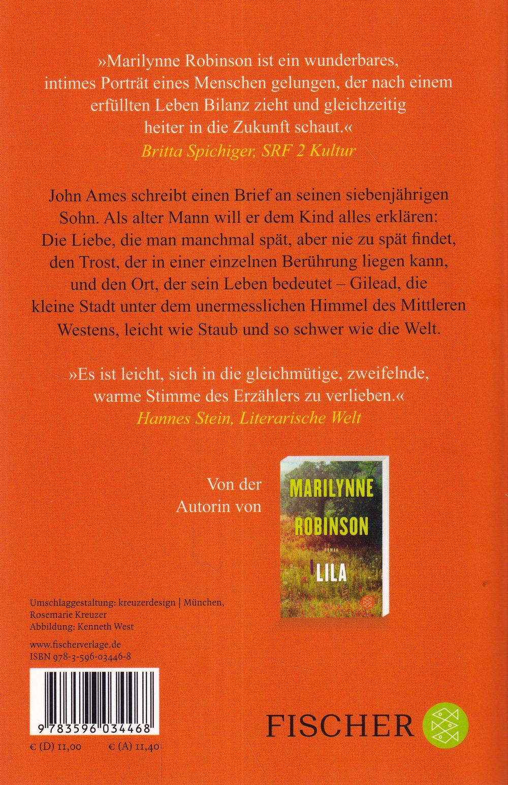 Auf seinem Sterbebett schreibt John Ames einen Brief an seinen siebenjährigen Sohn. Dem Kind will er alles erklären: Die Einsicht, mit der man das eigene Leben auf einen Schlag begreift, den Trost, der in einer einzelnen Berührung liegen kann, und den Ort, der sein Ende beschliesst: Gilead, die kleine Stadt unter dem unermesslichen Himmel des Mittleren Westens, leicht wie Staub und so schwer wie die Welt.