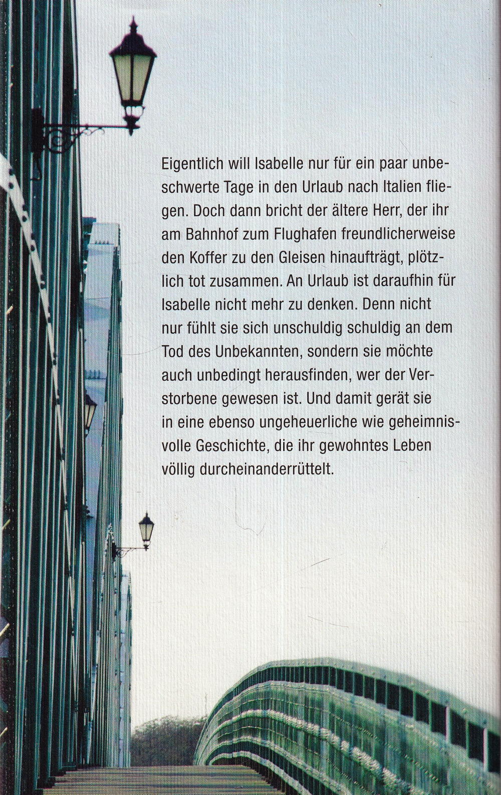 Eigentlich will Isabelle nur für ein paar unbeschwerte Tage in den Urlaub nach Italien fliegen. Doch dann bricht der ältere Herr, der ihr am Bahnhof zum Flughafen freundlicherweise den Koffer zu den Gleisen hinaufträgt, plötzlich tot zusammen. Und damit gerät Isabelle in eine ebenso ungeheuerliche wie geheimnisvolle Geschichte, die ihr gewohntes Leben völlig durcheinanderrüttelt.