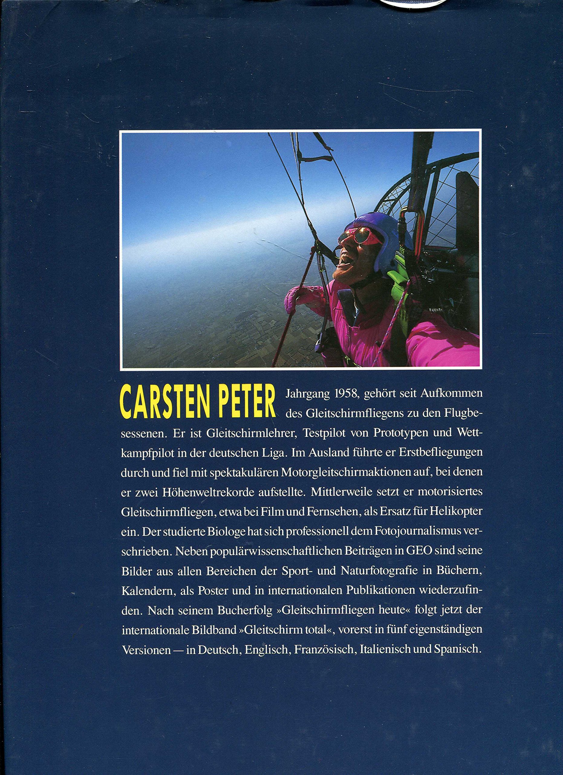 CARSTEN PETER Jahrgang 1958, gehört seit Aufkommen des Gleitschirmfliegens zu den Flugbesessenen. Er ist Gleitschirmlehrer, Testpilot Prototypen und Wettkampfpilot in der deutschen Liga. Im Ausland führte er Erstbefliegungen Von durch und fiel mit spektakulären Motorgleitschirmaktionen auf, bei denen er zwei Höhenweltrekorde aufstellte. Mittlerweile setzt er motorisiertes Gleitschirmfliegen, etwa bei Film und Fernsehen, als Ersatz für Helikopter ein. Der studierte Biologe hat sich professionell dem Fotojournalismus ver-IS schrieben. Neben populärwissenschaftlichen Beiträgen in GEO sind seine Bilder aus allen Bereichen der Sport- und Naturfotografie in Büchern, Kalendern, als Poster und in internationalen Publikationen wiederzufinden. Nach seinem Bucherfolg "Gleitschirmfliegen heute" folgt jetzt der internationale Bildband "Gleitschirm total", vorerst in fünf eigenständigen Versionen-in Deutsch, Englisch, Französisch, Italienisch und Spanisch.