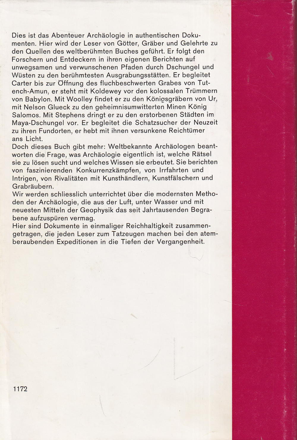 Dies ist das Abenteuer Archäologie in authentischen Dokumenten. Hier wird der Leser von Götter, Gräber und Gelehrte zu den Quellen des weltberühmten Buches geführt. Er folgt den Forschern und Entdeckern in ihren eigenen Berichten auf unwegsamen und verwunschenen Pfaden durch Dschungel und Wüsten zu den berühmtesten Ausgrabungsstätten. Er begleitet Carter bis zur Offnung des fluchbeschwerten Grabes von Tutench-Amun, er steht mit Koldewey vor den kolossalen Trümmern von Babylon. Mit Woolley findet er zu den Königsgräbern von Ur, mit Nelson Glueck zu den geheimnisumwitterten Minen König Salomos. Mit Stephens dringt er zu den erstorbenen Städten im Maya-Dschungel vor. Er begleitet die Schatzsucher der Neuzeit zu ihren Fundorten, er hebt mit ihnen versunkene Reichtümer ans Licht.
