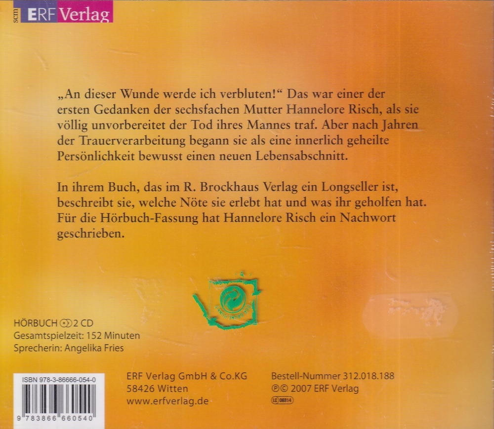 „An dieser Wunde werde ich verbluten!“Das war einer der ersten Gedanken der sechsfachen Mutter Hannelore Risch, als sie völlig unvorbereitet der Tod ihres Mannes traf. Aber nach Jahren der Trauerverarbeitung begann sie als eine innerlich geheilte Persönlichkeit bewusst einen neuen Lebensabschnitt.