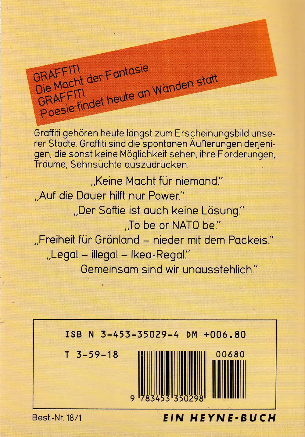 Graffiti gehören heute längst zum Erscheinungsbild unserer Städte. Graffiti sind die spontanen Äusserungen derjenigen, die sonst keine Möglichkeit sehen, ihre Forderungen, Träume, Sehnsüchte auszudrücken.