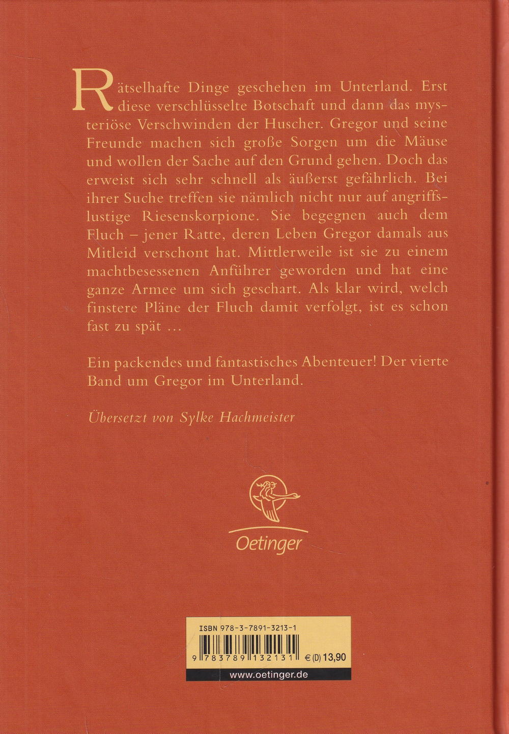 Rätselhafte Dinge geschehen im Unterland. Gregor und Luxa erreicht eine verschlüsselte Botschaft der Huscher – ein verzweifelter Hilferuf. Die beiden machen sich grosse Sorgen und machen sich auf die gefährliche Suche nach den Mäusen, um sie zu retten. Auf ihrem Weg werden sie von angriffslustigen Riesenskorpionen bedroht und begegnen dem Fluch, jener weissen Ratte, die Gregor einst aus Mitleid verschont hat. Sie ist zu einem machtbesessenen Anführer herangewachsen und verfolgt mit einer ganzen Armee wütender Ratten einen tödlichen Plan.