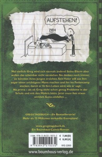 Mal ehrlich: Greg wird sich niemals ändern! Seine Eltern aber wollen das scheinbar nicht verstehen. Sie denken noch immer, sie könnten ihn erziehen. Sein Vater will aus ihm sogar einen richtigen Mann machen und ihn ins Feriencamp stecken, damit er fit fürs Leben wird. Als ob Greg nicht schon genug Probleme mit der Schule und den Mädels hat. Jetzt muss ihm etwas wirklich Gutes einfallen...