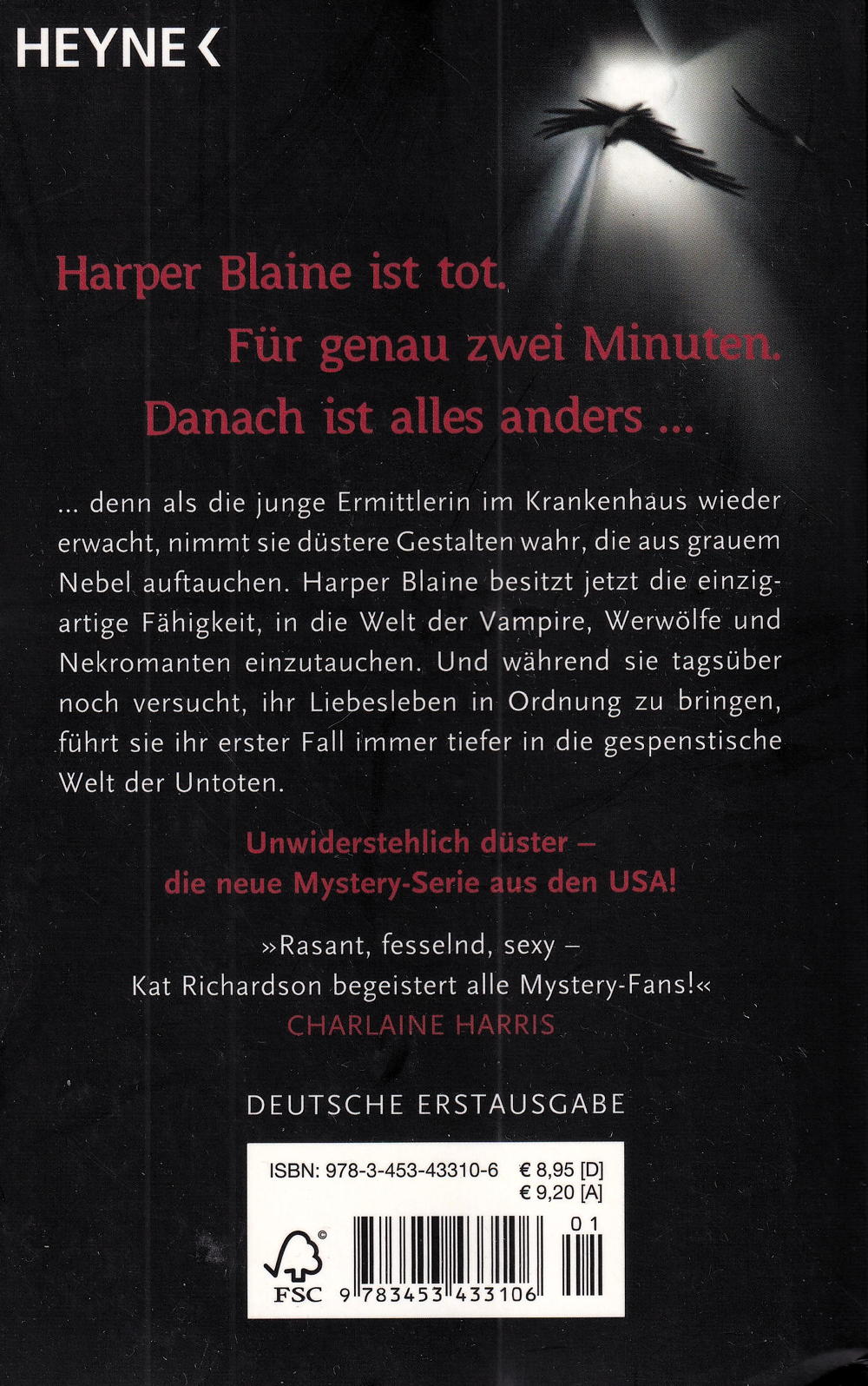 ...denn als die junge Ermittlerin im Krankenhaus wieder erwacht, nimmt sie düstere Gestalten wahr, die aus grauem Nebel auftauchen. Harper Blaine besitzt jetzt die einzigartige Fähigkeit, in die Welt der Vampire, Werwölfe und Nekromanten einzutauchen. Und während sie tagsüber noch versucht, ihr Liebesleben in Ordnung zu bringen, führt sie ihr erster Fall immer tiefer in die gespenstische Welt der Untoten.