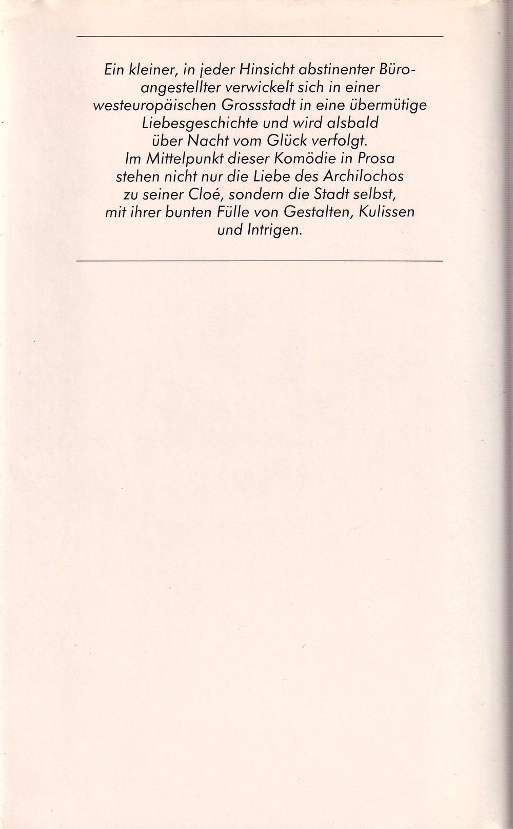 Im Mittelpunkt dieser Komödie in Prosa stehen nicht nur die Liebe des Archilochos zu seiner Cloé, sondern die Stadt selbst, mit ihrer bunten Fülle von Gestalten, Kulissen und Intrigen.