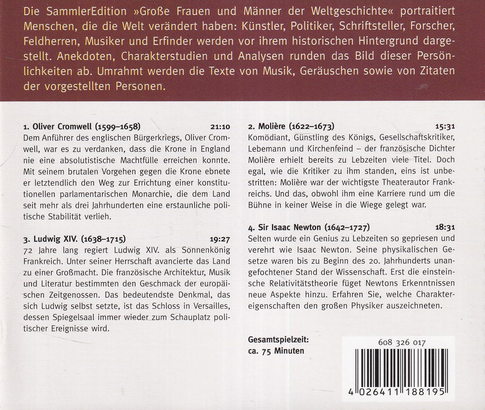 Die SammlerEdition »Grosse Frauen und Männer der Weltgeschichte« portraitiert Menschen, die die Welt verändert haben: Künstler, Politiker, Schriftsteller, Forscher, Feldherren, Musiker und Erfinder werden vor ihrem historischen Hintergrund dargestellt. Anekdoten, Charakterstudien und Analysen runden das Bild dieser Persönlichkeiten ab. Umrahmt werden die Texte von Musik, Geräuschen sowie von Zitaten der vorgestellten Personen.