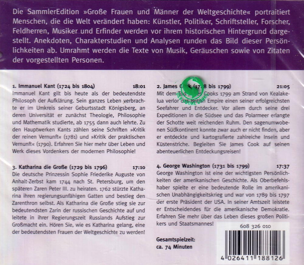 Die SammlerEdition »Grosse Frauen und Männer der Weltgeschichte« portraitiert Menschen, die die Welt verändert haben: Künstler, Politiker, Schriftsteller, Forscher, Feldherren, Musiker und Erfinder werden vor ihrem historischen Hintergrund dargestellt. Anekdoten, Charakterstudien und Analysen runden das Bild dieser Persönlichkeiten ab. Umrahmt werden die Texte von Musik, Geräuschen sowie von Zitaten der vorgestellten Personen.
