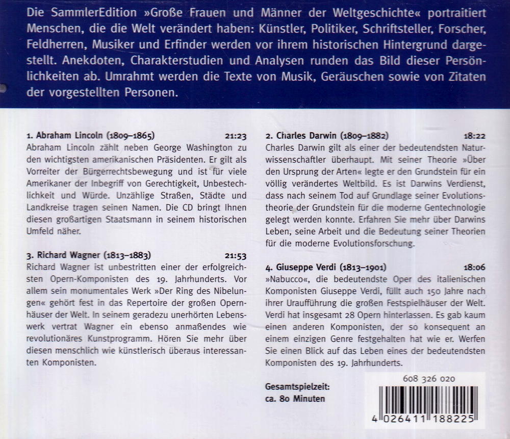 Die SammlerEdition »Grosse Frauen und Männer der Weltgeschichte« portraitiert Menschen, die die Welt verändert haben: Künstler, Politiker, Schriftsteller, Forscher, Feldherren, Musiker und Erfinder werden vor ihrem historischen Hintergrund dargestellt. Anekdoten, Charakterstudien und Analysen runden das Bild dieser Persönlichkeiten ab. Umrahmt werden die Texte von Musik, Geräuschen sowie von Zitaten der vorgestellten Personen.