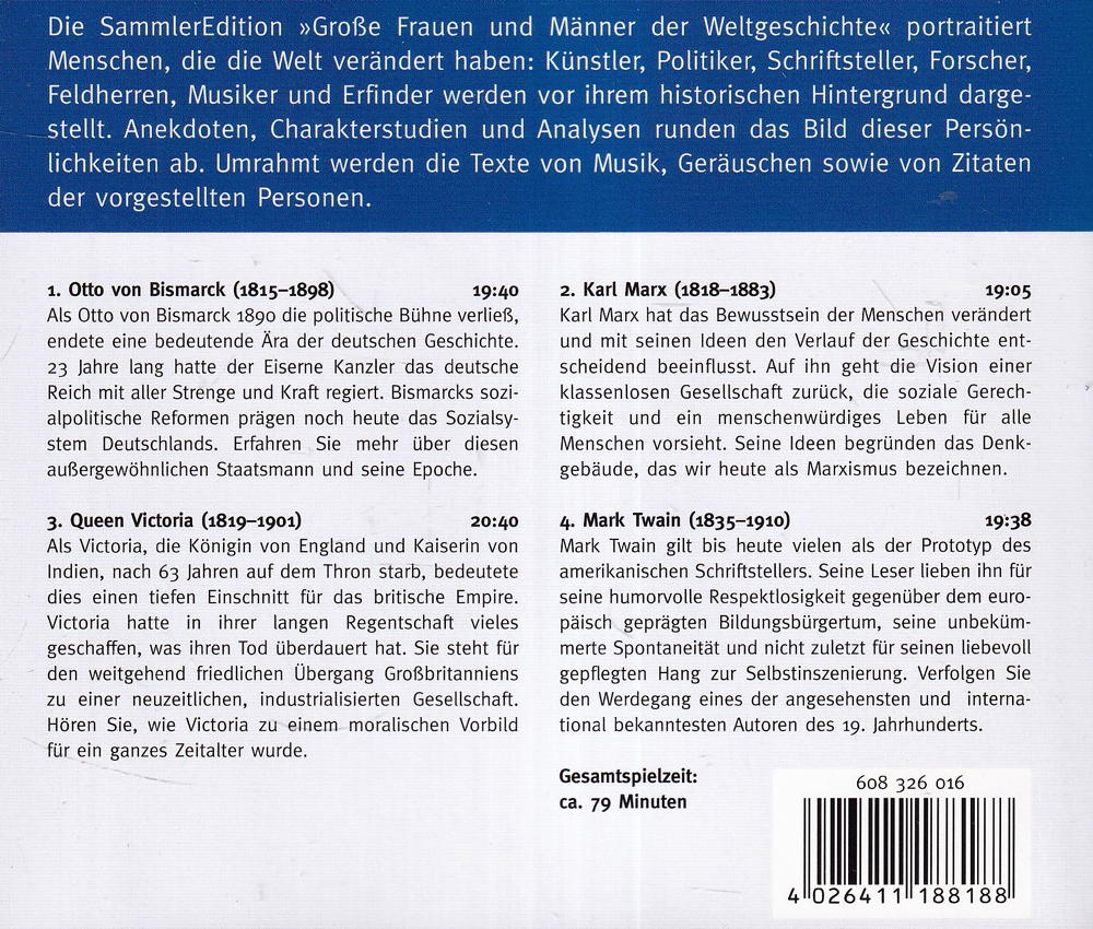 Die SammlerEdition »Grosse Frauen und Männer der Weltgeschichte« portraitiert Menschen, die die Welt verändert haben: Künstler, Politiker, Schriftsteller, Forscher, Feldherren, Musiker und Erfinder werden vor ihrem historischen Hintergrund dargestellt. Anekdoten, Charakterstudien und Analysen runden das Bild dieser Persönlichkeiten ab. Umrahmt werden die Texte von Musik, Geräuschen sowie von Zitaten der vorgestellten Personen.