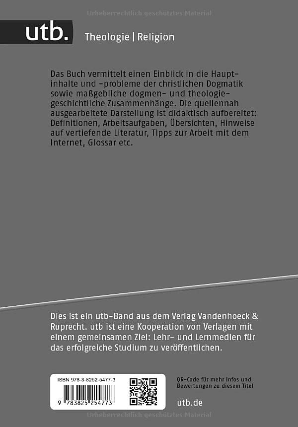 Das Buch vermittelt einen Einblick in die Hauptinhalte und -probleme der christlichen Dogmatik sowie massgebliche dogmen- und theologiegeschichtliche Zusammenhänge. Die quellennah ausgearbeitete Darstellung ist didaktisch aufbereitet: Definitionen, Arbeitsaufgaben, Übersichten, Hinweise auf vertiefende Literatur, Tipps zur Arbeit mit dem Internet, Glossar etc. völlig neu bearbeitet.
