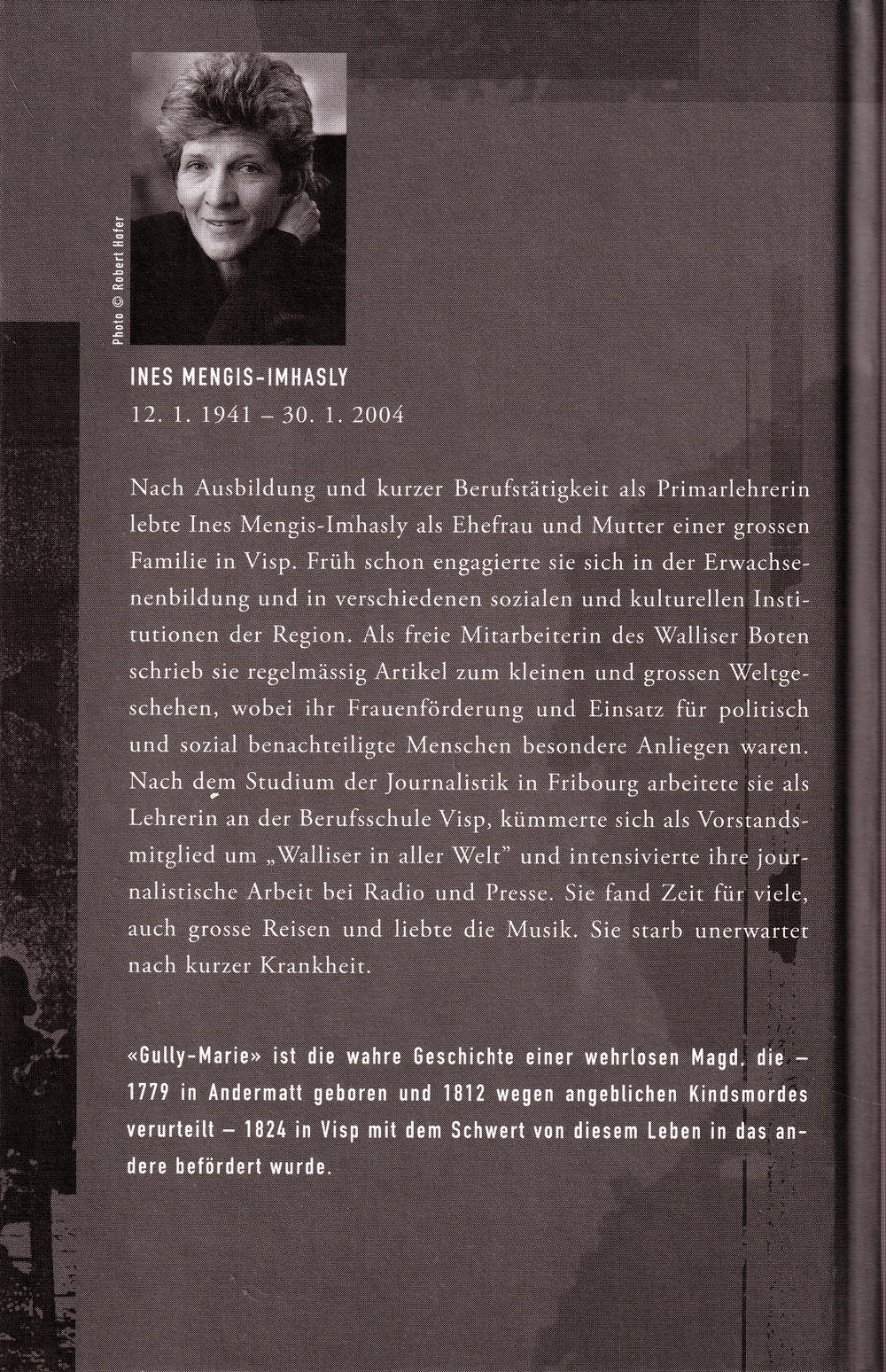 Sie wird am 1. Juni 1824 in Visp enthauptet. Kindes- oder Justizmord? Die Autorin lässt die Schuldfrage unbeantwortet. Was ihr am Herzen liegt, ist das Schicksal einer Unterprivilegierten, die von den Männern missbraucht und in der Not schmählich im Stich gelassen wird. Jene Partien, in denen sich die Autorin in ihre „Heldin“ hineinversetzt und ihre ausweglose Situation von innen her schildert, stellen die Glanzlichter der Erzählung dar.