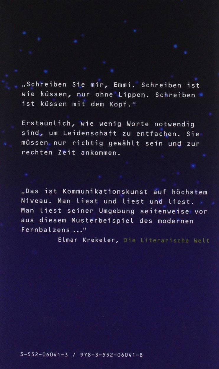 Ein reger Austausch entsteht, schnell spielen Gefühle mit. Vor einem Treffen aber schrecken beide zurück. Denn Emmi ist verheiratet und Leo laboriert noch an einer gescheiterten Beziehung. Und überhaupt: Werden die elektronisch überbrachten Liebesgefühle einer Begegnung standhalten? Und wenn ja: Lohnt es sich, alles auf eine Karte zu setzen - für eine Liebe, die aus nichts als einem Zufall entstanden ist?