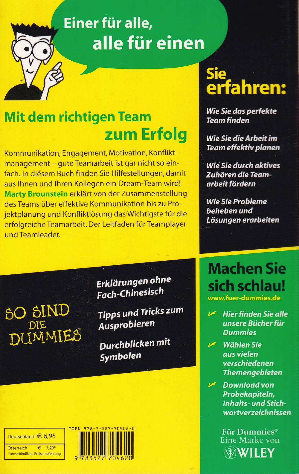 Kommunikation, Engagement, Motivation, Konfliktmanagement - Teamarbeit ist ein hartes Stück Arbeit, und das sowohl für den Teamleiter als auch für die Mitglieder des Teams. In diesem Buch finden Sie jede Menge Hilfestellungen, damit aus Ihnen und Ihren Kollegen ein Dream-Team wird! Marty Brounstein erklärt von der Zusammenstellung des Teams über die effektive und aktive Kommunikation bis hin zu Projektplanung und Konfliktlösung das Wichtigste zur erfolgreichen Teamarbeit. Praxisnahe Anregungen machen das Arbeiten im Team zum Kinderspiel. Teamfähigkeit ist in allen Unternehmen gefragt. Doch oft ist die Zusammenarbeit verschiedener Persönlichkeiten gar nicht so einfach. Erfahren Sie das Wichtigste über Planung, Kommunikation und Konfliktmanagement. Der Leitfaden für Teamplayer und Teamleader.