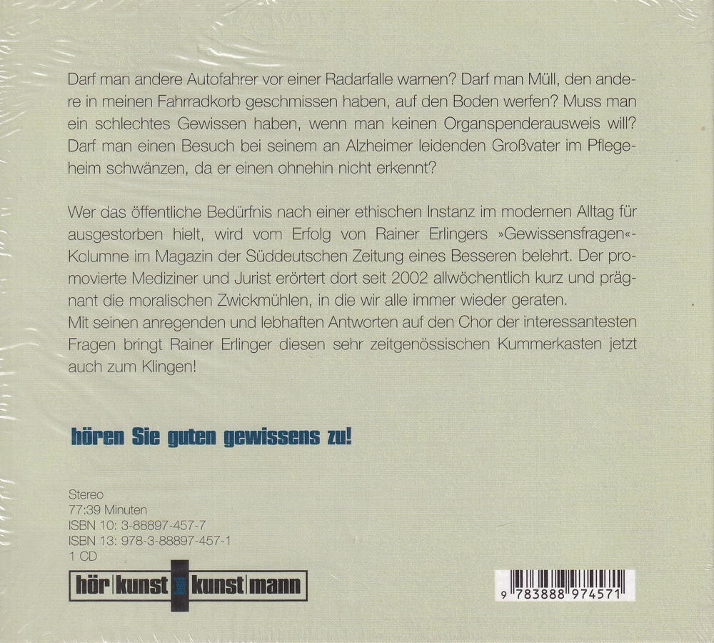 Darf man andere Autofahrer vor einer Radarfalle warnen? Darf man Müll, den andere in meinen Fahrradkorb geschmissen haben, auf den Boden werfen? Muss man ein schlechtes Gewissen haben, wenn man keinen Organspenderausweis will? Darf man einen Besuch bei seinem an Alzheimer leidenden Grossvater im Pflegeheim schwänzen, da er einen ohnehin nicht erkennt? Wer das öffentliche Bedürfnis nach einer ethischen Instanz im modernen Alltag für ausgestorben hielt, wird vom Erfolg von Rainer Erlingers »Gewissensfragen«-Kolumne im Magazin der Süddeutschen Zeitung eines Besseren belehrt. Der promovierte Mediziner und Jurist erörtert dort seit 2002 allwöchentlich kurz und prägnant die moralischen Zwickmühlen, in die wir alle immer wieder geraten. Mit seinen anregenden und lebhaften Antworten auf den Chor der interessantesten Fragen bringt Rainer Erlinger diesen sehr zeitgenössischen Kummerkasten jetzt auch zum Klingen!