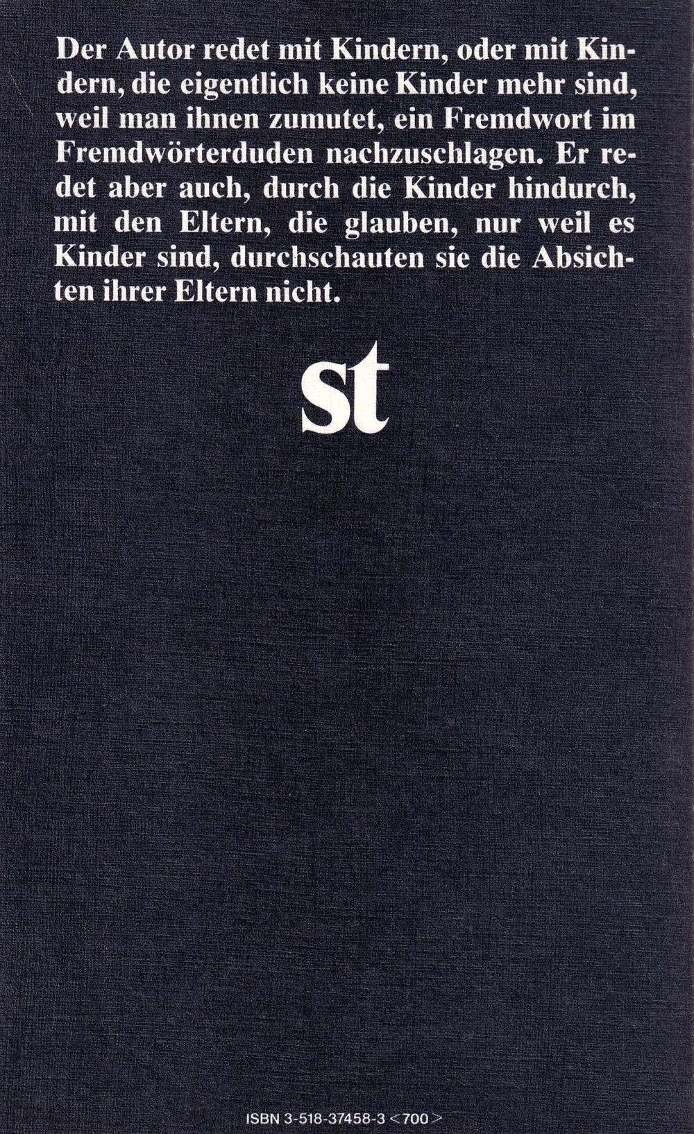 Der Autor redet mit Kindern, oder mit Kindern, die eigentlich keine Kinder mehr sind, weil man ihnen zumutet, ein Fremdwort im Fremdwörterduden nachzuschlagen. Er redet aber auch, durch die Kinder hindurch, mit den Eltern, die glauben, nur weil es Kinder sind, durchschauen sie die Absichten ihrer Eltern nicht.