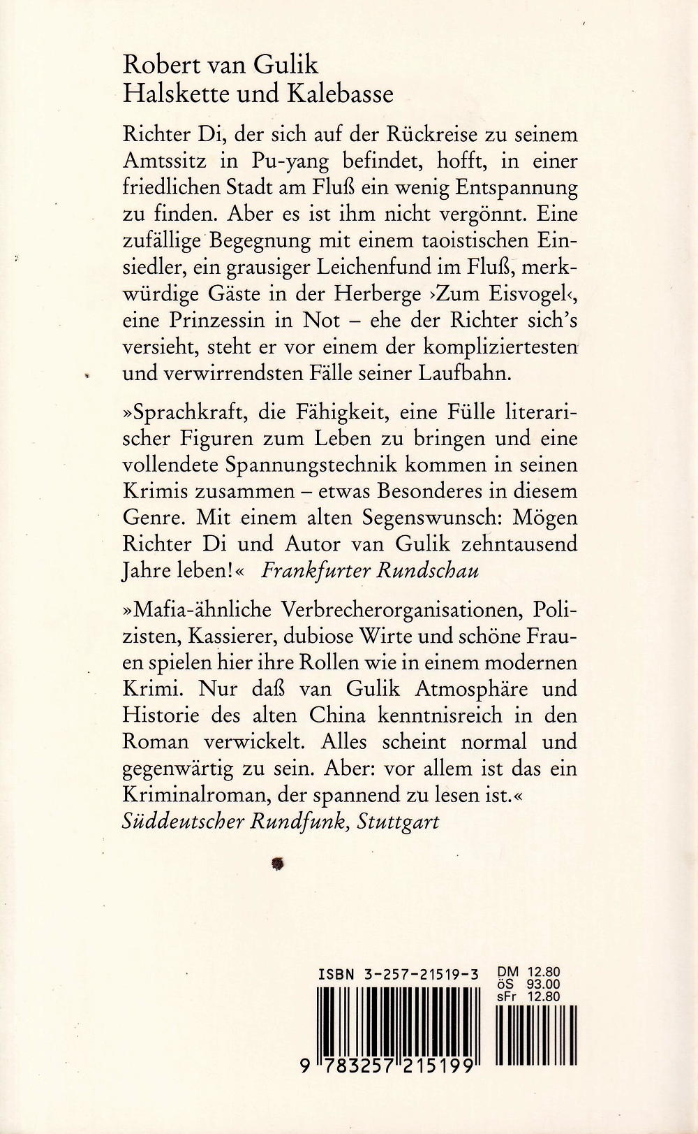 Richter Di, der sich auf der Rückreise zu seinem Amtssitz in Pu-yang befindet, hofft, in einer friedlichen Stadt am Fluss ein wenig Entspannung zu finden. Doch nach einer Begegnung mit einem taoistischen Einsiedler, einem grausigen Leichenfund im Fluss, merkwürdigen Gästen in der Herberge 'Zum Eisvogel', einer Prinzessin in Not, steht der Richter vor einem der kompliziertesten Fälle seiner Laufbahn.