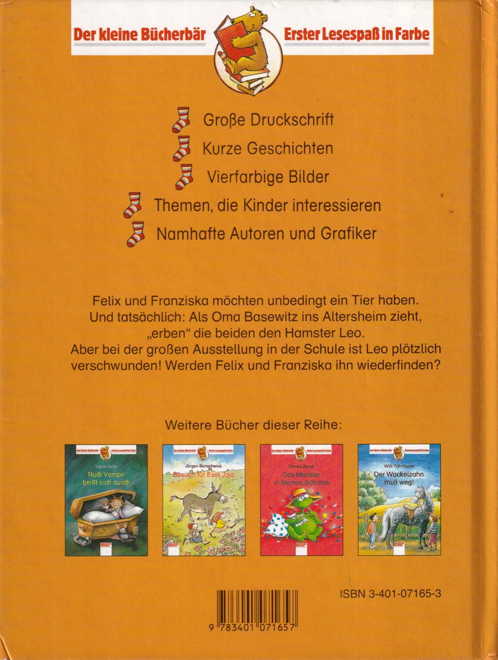 Felix und Franziska möchten unbedingt ein Tier haben. Und tatsächlich: Als Oma Basewitz ins Altersheim zieht, „erben““die beiden den Hamster Leo. Aber bei der grossen Ausstellung in der Schule ist Leo plötzlich verschwunden! Werden Felix und Franziska ihn wiederfinden?