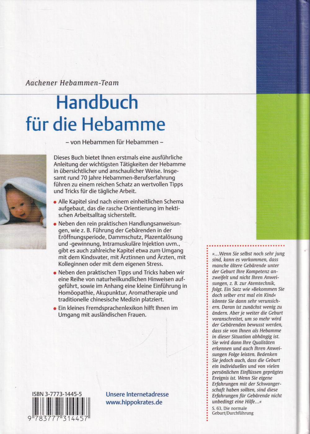 Ein kleines Fremdsprachenlexikon hilft im Umgang mit ausländischen Frauen. Ein Glossar bzw. Vor- und Endsilben-Verzeichnis der medizinischen Fachsprache erleichtern den Umgang mit der Fachsprache. Hier erhalten Sie eine ausführliche und übersichtliche Anleitung aller wichtigen Tätigkeiten der Hebamme. Zahlreiche Farbabbildungen und Grafiken sorgen für besonders grosse Anschaulichkeit. Alle Kapitel sind nach einem einheitlichen Schema aufgebaut und ermöglichen eine rasche Orientierung im hektischen Arbeitsalltag.