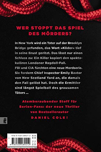 »Wie fasst man einen Mörder, der längst tot ist?« -Vom Autor des Spiegel-Bestsellers Ragdoll. Dein letzter Tag. In New York wurde ein Toter an der Brooklyn Bridge aufgehängt, das Wort „Köder“ tief in seine Brust geritzt. Das lässt nur einen Schluss zu: Ein Killer kopiert den berühmten Londoner Ragdoll-Fall. Chief Inspector Emily Baxter wird sofort von den US-Ermittlern angefordert. In den USA ist der Druck der Medien enorm. Als ein zweiter Toter entdeckt wird, diesmal mit dem Wort Puppe auf der Brust, dreht die Presse völlig durch und mit ihr die Internet-Communities. Baxter und ihre Kollegen von FBI und CIA werden zum Spielball des grausamen Mörders – wer kann seinen Irrsinn stoppen? Und wer hält im Hintergrund die Fäden in der Hand?