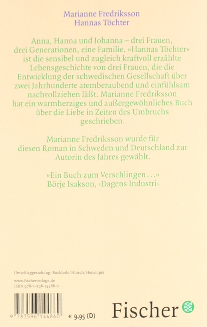Als Anna ihre fast 90-jährige Mutter Johanna im Pflegeheim besucht, ist diese nicht mehr ansprechbar. Anna ist zugleich traurig und wütend. So viele Fragen möchte sie noch stellen, so vieles möchte sie noch wissen über das Leben ihrer Mutter Johanna und ihrer Großmutter Hanna. Wie ist es gewesen vor fast hundert Jahren auf dem Land, als Hanna mit ihrem unehelichen Sohn Ragnar den Müller Broman heiratete? Wieso konnte sie sich später nie an das Leben in der Großstadt Göteborg gewöhnen? Wie hat sich ihre Mutter gefühlt, als der Vater starb, und warum hat sie niemals rebelliert gegen ihr tristes Hausfrauendasein? Jetzt ist es zu spät, all diese Fragen zu stellen. Anna - Tochter und Enkelin - begibt sich allein auf die Reise durch das Leben ihrer Mutter und Großmutter und findet mit Hilfe ihrer Aufzeichnungen Zugang zum Leben ihrer Vorfahren und vor allem zu sich selbst. Marianne Fredriksson hat ein spannendes Buch über die Liebe geschrieben, in dem sie die drei einprägsamen Lebenslinien von Anna, Hanna und Johanna durch hundert Jahre schwedische Geschichte nachzeichnet.