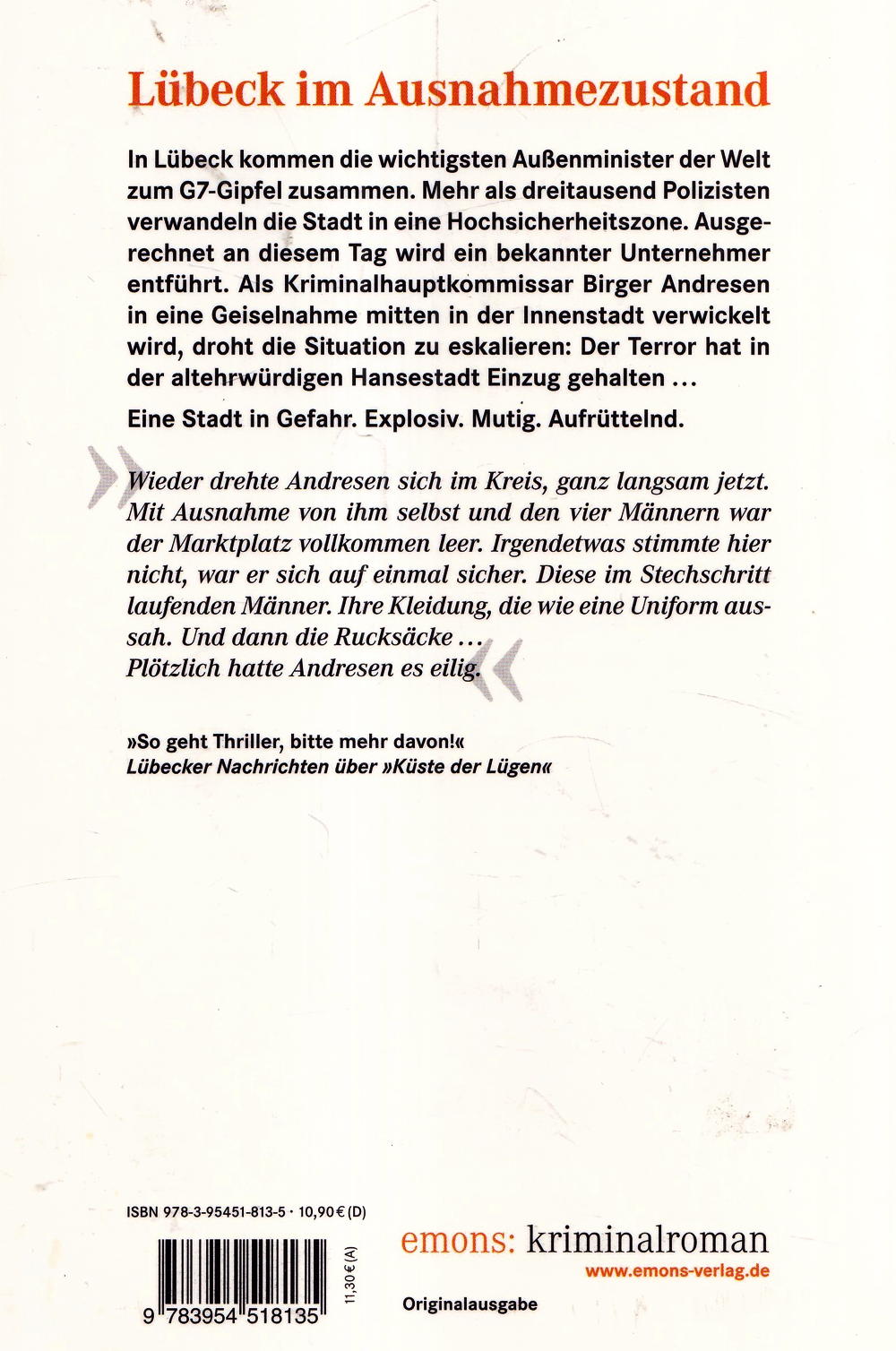 In Lübeck kommen die wichtigsten Aussenminister der Welt zum G7-Gipfel zusammen. Mehr als dreitausend Polizisten verwandeln die Stadt in eine Hochsicherheitszone. Ausgerechnet an diesem Tag wird ein bekannter Unternehmer entführt. Als Kriminalhauptkommissar Birger Andresen in eine Geiselnahme mitten in der Innenstadt verwickelt wird, droht die Situation zu eskalieren: Der Terror hat in der altehrwürdigen Hansestadt Einzug gehalten . . .