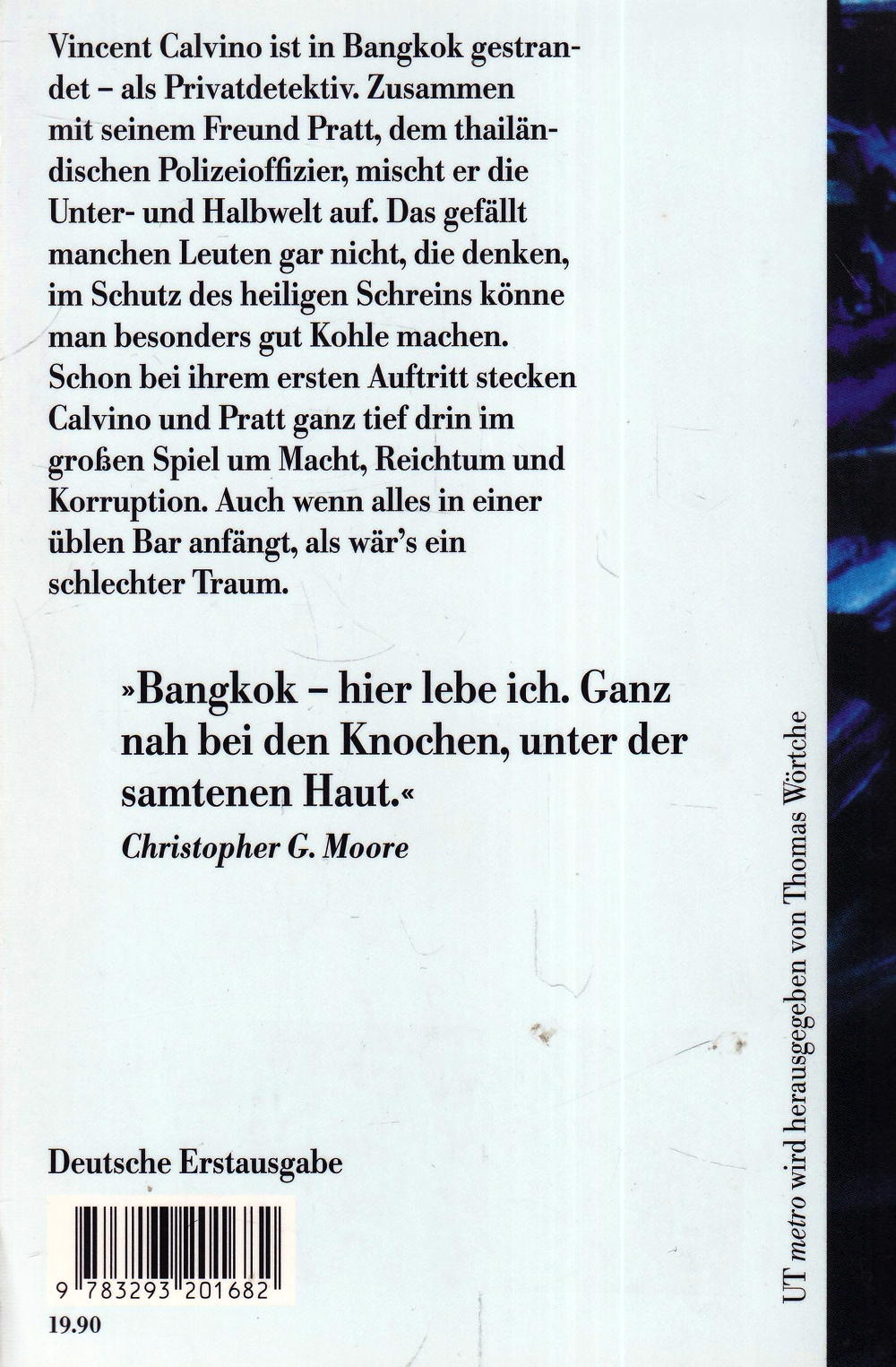 Christopher G. Moore, der sein Alter mit 83,5 Reisejahren angibt, war in seinem früheren Leben Juraprofessor, dann Theaterautor. Später wurde er, was er bis heute geblieben ist, Romancier. In Bangkok etablierte sich der gebürtige Kanadier, der in Oxford studiert hat, als 'Kultautor'. Zunächst in Bangkok selbst, dann mit Hilfe des Internets im Global Village. Es war nur eine Frage der Zeit, bis Hollywood aufmerksam wurde und Calvino-Stoffe einkaufte. Wenn Christopher G. Moore gerade mal nicht in Bangkok ist, dann ist er sicher in Manila, Oxford, Berlin oder Los Angeles anzutreffen. Sein Lebensgefühl umschrieb er in einem Statement zu seiner Verlagssituation: 'Meine Leser gehören zu einer globalen Vorhut, für die es nicht entscheidend ist, wo sie leben. Ich bin ein kanadischer Schriftsteller, der in Bangkok lebt. Mein aus Thailand stammender Agent in Paris wird von einem deutschen Agenten in Wien vertreten, der die Rechte an einen Verlag in Zürich verkaufte, dessen Herausgeber in Berlin sitzt.'