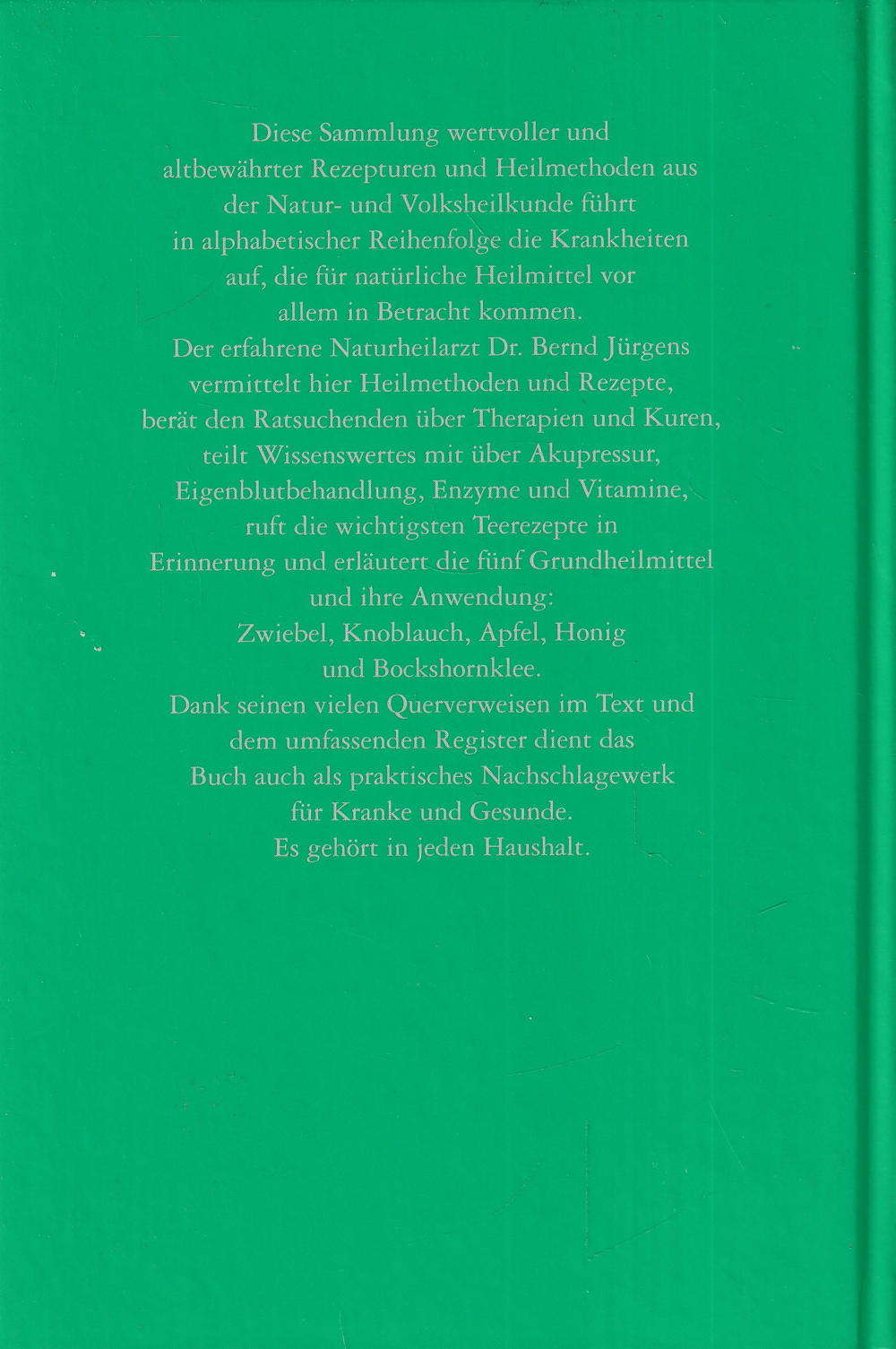 Der erfahrene Naturheilarzt Dr. Bernd Jürgens vermittelt hier Heilmethoden und Rezepte, berät den Ratsuchenden über Therapien und Kuren, teilt Wissenswertes mit über Akupressur, Eigenblutbehandlung, Enzyme und Vitamine, ruft die wichtigsten Teerezepte in Erinnerung und erläutert die fünf Grundheilmittel und ihre Anwendung: