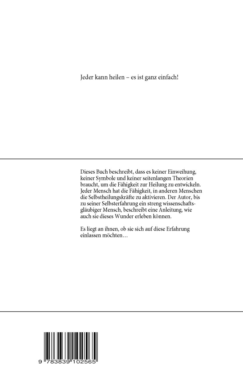 Jeder kann heilen – es ist ganz einfach!Dieses Buch beschreibt, dass es keiner Einweihung, keiner Symbole und keiner seitenlangen Theorien braucht, um die Fähigkeit zur Heilung zu entwickeln. Jeder Mensch hat die Fähigkeit, in anderen Menschen die Selbstheilungskräfte zu aktivieren. Der Autor, bis zu seiner Selbsterfahrung ein streng wissenschaftsgläubiger Mensch, beschreibt eine Anleitung, wie auch sie dieses Wunder erleben können. Es liegt an ihnen, ob sie sich auf diese Erfahrung einlassen möchten…