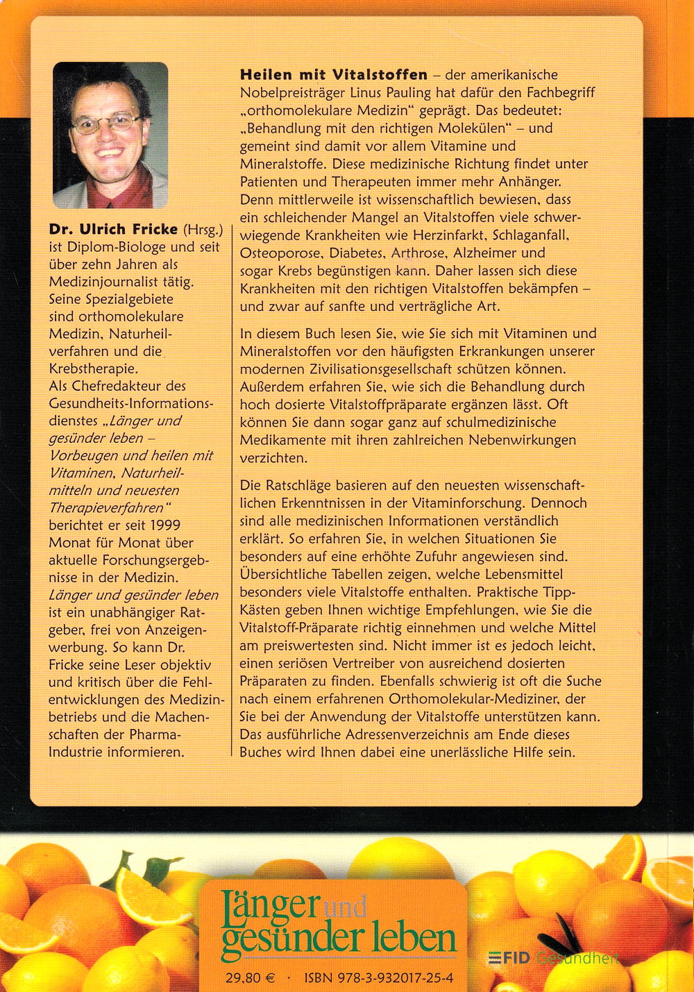 Inzwischen ist es wissenschaftlich erwiesen: Ein schleichender Mangel an Vitalstoffen kann viele schwerwiegende Krankheiten wie Herzinfarkt, Schlaganfall, Osteoporose, Diabetes, Arthrose, Alzheimer und sogar Krebs begünstigen. Daher können Sie diese Krankheiten mit den richtigen Vitalstoffen bekämpfen - und zwar auf sanfte und verträgliche Art. Schon der amerikanische Nobelpreisträger Linus Pauling hat dies erkannt und prägte dafür den Fachbegriff orthomolekulare Medizin (Behandlung mit den richtigen Molekülen). Diese neue medizinische Richtung findet auch unter Patienten und Therapeuten immer mehr Anhänger. Die neuesten wissenschaftlichen Erkenntnisse über Vitamine, Mineralstoffe und Nahrungsergänzungsmittel finden Sie jetzt leicht verständlich zusammengefasst in diesem aktuellen Ratgeber - zur Vorbeugung und Therapie. Erfahren Sie jetzt: Wie Sie sich mit Vitalstoffen vor den häufigsten Erkrankungen unserer modernen Zivilisationsgesellschaft schützen und einen schleichenden Mangel verhindern Wie Sie eine Behandlung schon bestehender Krankheiten durch hoch dosierte Vitalstoff-präparate ergänzen - und dann oft sogar ganz auf schulmedizinische Präparate verzichten können In welchen Situationen Ihr Körper mehr Vitalstoffen braucht Welche Lebensmittel besonders viele Vitamine und Mineralstoffe enthalten und wie viel Sie davon verzehren sollten Wie Sie Vitalstoff-Präparate richtig einnehmen und welche Mittel am preiswertesten sind Wie Sie einen erfahrenen Therapeuten finden, der Sie bei der Anwendung der Vitalstoffen unterstützen kann Als mündiger und aufgeklärter Patient sollten Sie unbedingt über die Heilerfolge der Vitalstoff-Therapie Bescheid wissen - dieses Buch wird Ihnen dabei ein unverzichtbarer Ratgeber sein.