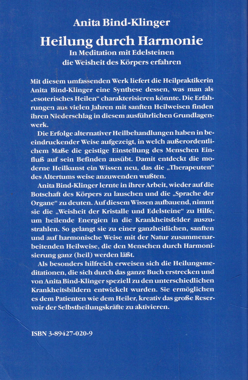 Anita Bind-Klinger lernte in ihrer Arbeit, wieder auf die Botschaft des Körpers zu lauschen und die „Sprache der Organe“zu deuten. Auf diesem Wissen aufbauend, nimmt sie die „Weisheit der Kristalle und Edelsteine“zu Hilfe, um heilende Energien in die Krankheitsfelder auszustrahlen. So gelangt sie zu einer ganzheitlichen, sanften und auf harmonische Weise mit der Natur zusammenarbeitenden Heilweise, die den Menschen durch Harmonisierung ganz (heil) werden lässt.