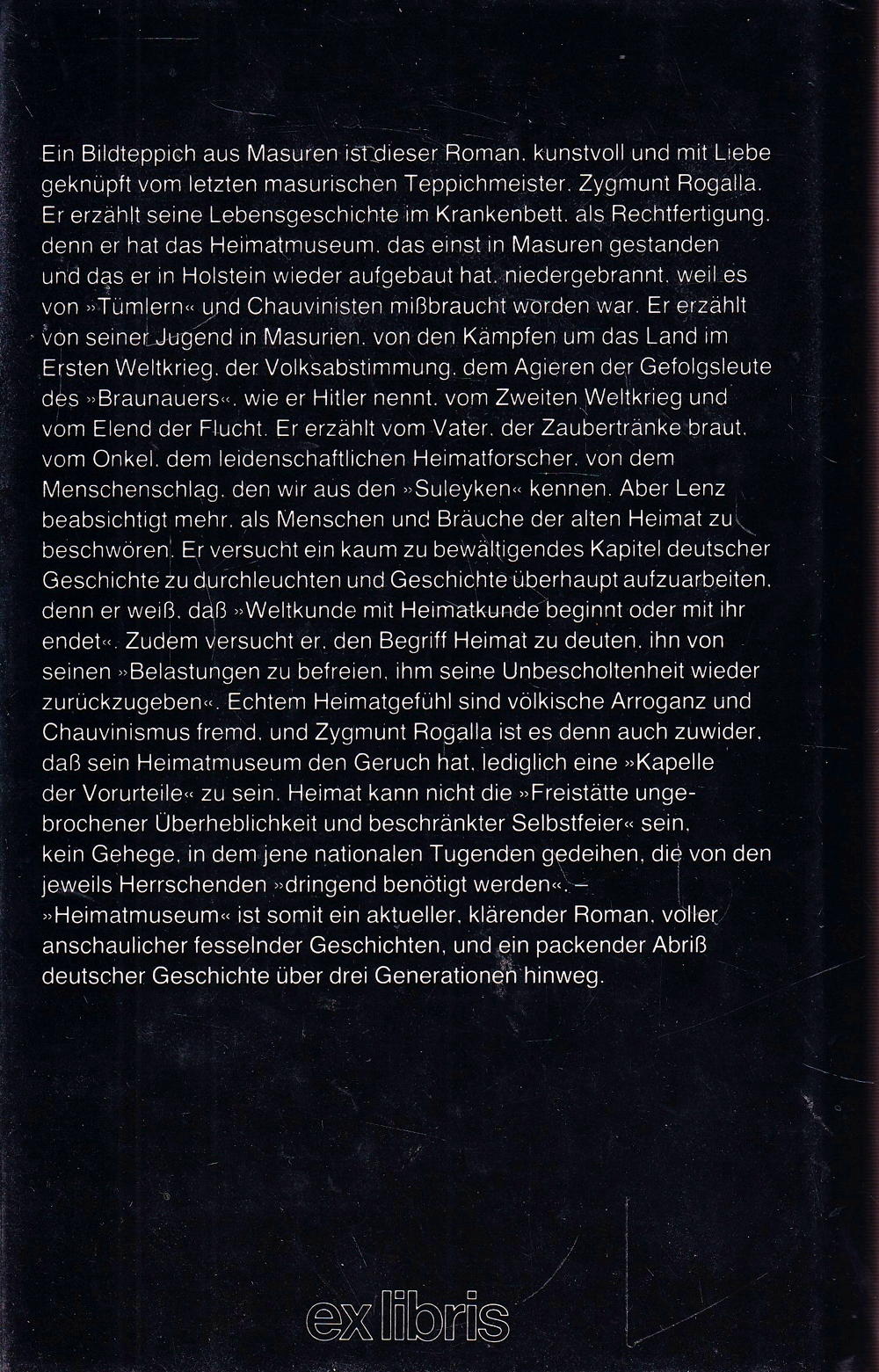 Er erzählt seine Lebensgeschichte im Krankenbett. Als Rechtfertigung, denn er hat das Heimatmuseum, das einst in Masuren gestanden und das er in Holstein wieder aufgebaut hat, Niedergebrannt, weil es von »Tümlern« und Chauvinisten missbraucht worden war. Er erzählt von seiner Jugend in Masurien, von den Kämpfen um das Land im Ersten Weltkrieg. Der Volksabstimmung. Dem Agieren der Gefolgsleute des »Braunauers«. Wie er Hitler nennt. Vom Zweiten Weltkrieg und vom Elend der Flucht. Er erzählt vom Vater. Der Zaubertränke braut, vom Onkel, dem leidenschaftlichen Heimatforscher. Von dem Menschenschlag. Den wir aus den »Suleyken« kennen. Aber Lenz beabsichtigt mehr. Als Menschen und Bräuche der alten Heimat zu beschwören. Er versucht ein kaum zu bewältigendes Kapitel deutscher Geschichte zu durchleuchten und Geschichte überhaupt aufzuarbeiten, denn er weiss.