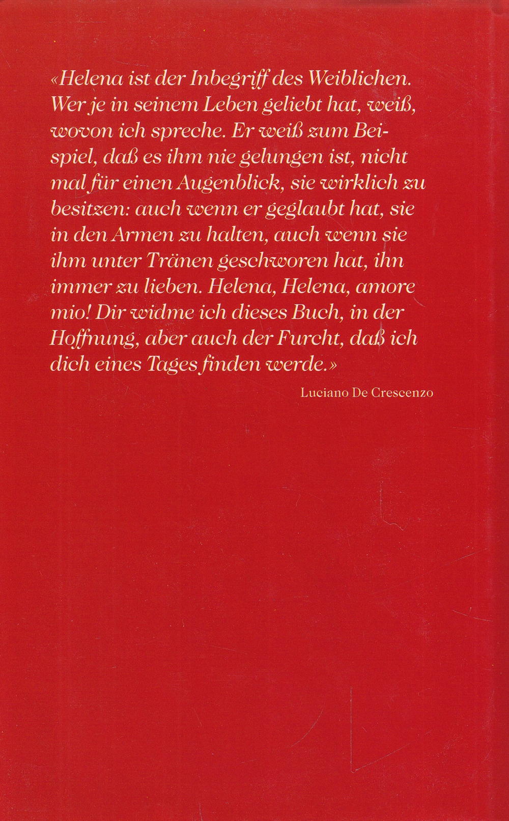«Helena ist der Inbegriff des Weiblichen. Wer je in seinem Leben geliebt hat, weiss, wovon ich spreche. Er weiss zum Beispiel, dass es ihm nie gelungen ist, nicht mal für einen Augenblick, sie wirklich zu besitzen: auch wenn er geglaubt hat, sie in den Armen zu halten, auch wenn sie ihm unter Tränen geschworen hat, ihn immer zu lieben. Helena, Helena, amore mio! Dir widme ich dieses Buch, in der Hoffnung, aber auch der Furcht, dass ich dich eines Tages finden werde. »