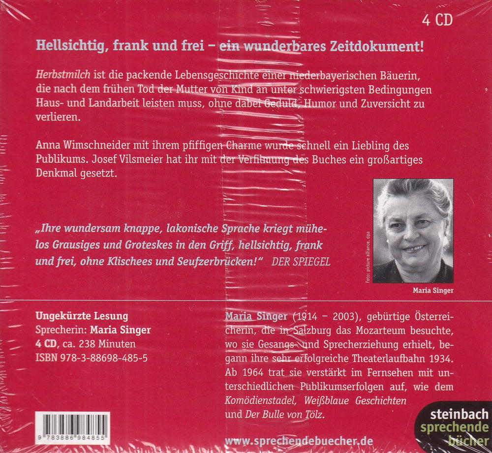 Anna Wimschneider, 1919 - 1993, lebte über viele Jahrzehnte auf einem kleinen Bauernhof in der Nähe von Pfarrkirchen in Niederbayern. Ihre Lebenserinnerungen mit dem Titel "Herbstmilch", die 1984 erschienen sind, wurden über Nacht zum Bestseller und von Joseph Vilsmaier erfolgreich verfilmt. Bis heute sind sie ein berührendes Zeugnis.