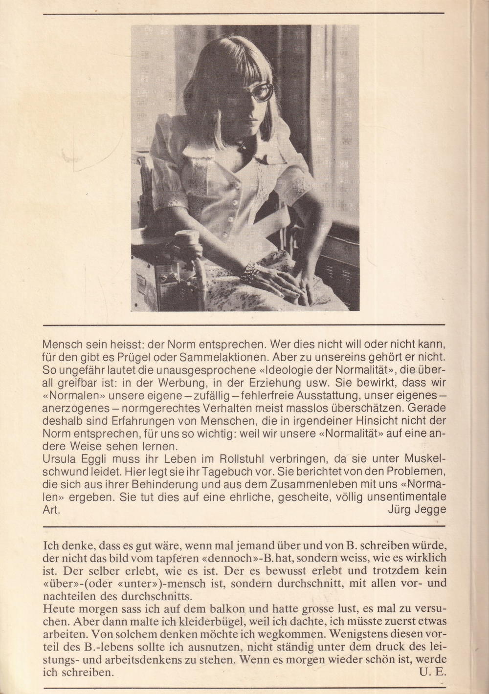 Ursula Eggli muss ihr Leben im Rollstuhl verbringen, da sie unter Muskelschwund leidet. Hier legt sie ihr Tagebuch vor. Sie berichtet von den Problemen, die sich aus ihrer Behinderung und aus dem Zusammenleben mit uns «Normalen» ergeben. Sie tut dies auf eine ehrliche, gescheite, völlig unsentimentale Art.