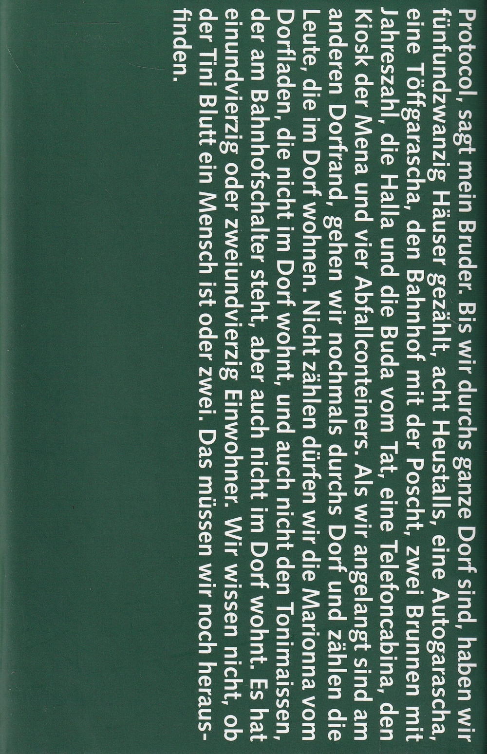 Protocol, sagt mein Bruder. Bis wir durchs ganze Dorf sind, haben wir fünfundzwanzig Häuser gezählt, acht Heustalls, eine Autogarascha, eine Töffgarascha, den Bahnhof mit der Poscht, zwei Brunnen mit Jahreszahl, die Halla und die Buda vom Tat, eine Telefoncabina, den Kiosk der Mena und vier Abfallconteiners. Als wir angelangt sind am anderen Dorfrand, gehen wir nochmals durchs Dorf und zählen die Leute, die im Dorf wohnen. Nicht zählen dürfen wir die Marionna vom Dorfladen, die nicht im Dorf wohnt, und auch nicht den Tonimaissen, der am Bahnhofschalter steht, aber auch nicht im Dorf wohnt. Es hat einundvierzig oder zweiundvierzig Einwohner. Wir wissen nicht, ob der Tini Blutt ein Mensch ist oder zwei. Das müssen wir noch herausfinden.