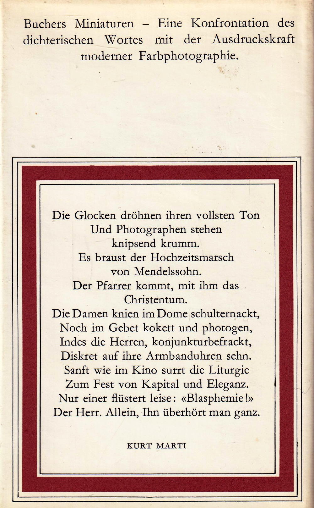 Die Damen knien im Dome schulternackt, Noch im Gebet kokett und photogen, Indes die Herren, konjunkturbefrackt, Diskret auf ihre Armbanduhren sehn.
