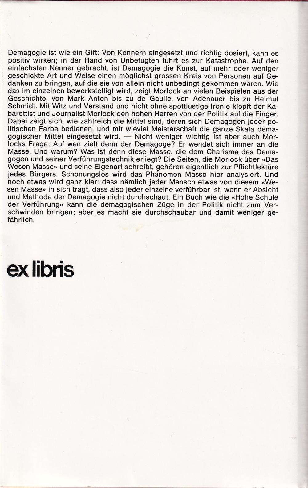 Dabei zeigt sich, wie zahlreich die Mittel sind, deren sich Demagogen jeder politischen Farbe bedienen, und mit wieviel Meisterschaft die ganze Skala dema gogischer Mittel eingesetzt wird. Nicht weniger wichtig ist aber auch Morlocks Frage: Auf wen zielt denn der Demagoge? Er wendet sich immer an die Masse. Und warum? Was ist denn diese Masse, die dem Charisma des Dema gogen und seiner Verführungstechnik erliegt? Die Seiten, die Morlock über Das Wesen Masse» und seine Eigenart schreibt, gehören eigentlich zur Pflichtlektüre jedes Bürgers. Schonungslos wird das Phänomen Masse hier analysiert. Und noch etwas wird ganz klar: dass nämlich jeder Mensch etwas von diesem «Wesen Masse» in sich trägt, dass also jeder einzelne verführbar ist, wenn er Absicht und Methode der Demagogie nicht durchschaut. Ein Buch wie die «Hohe Schule der Verführung kann die demagogischen Züge in der Politik nicht zum Verschwinden bringen; aber es macht sie durchschaubar und damit weniger gefährlich.