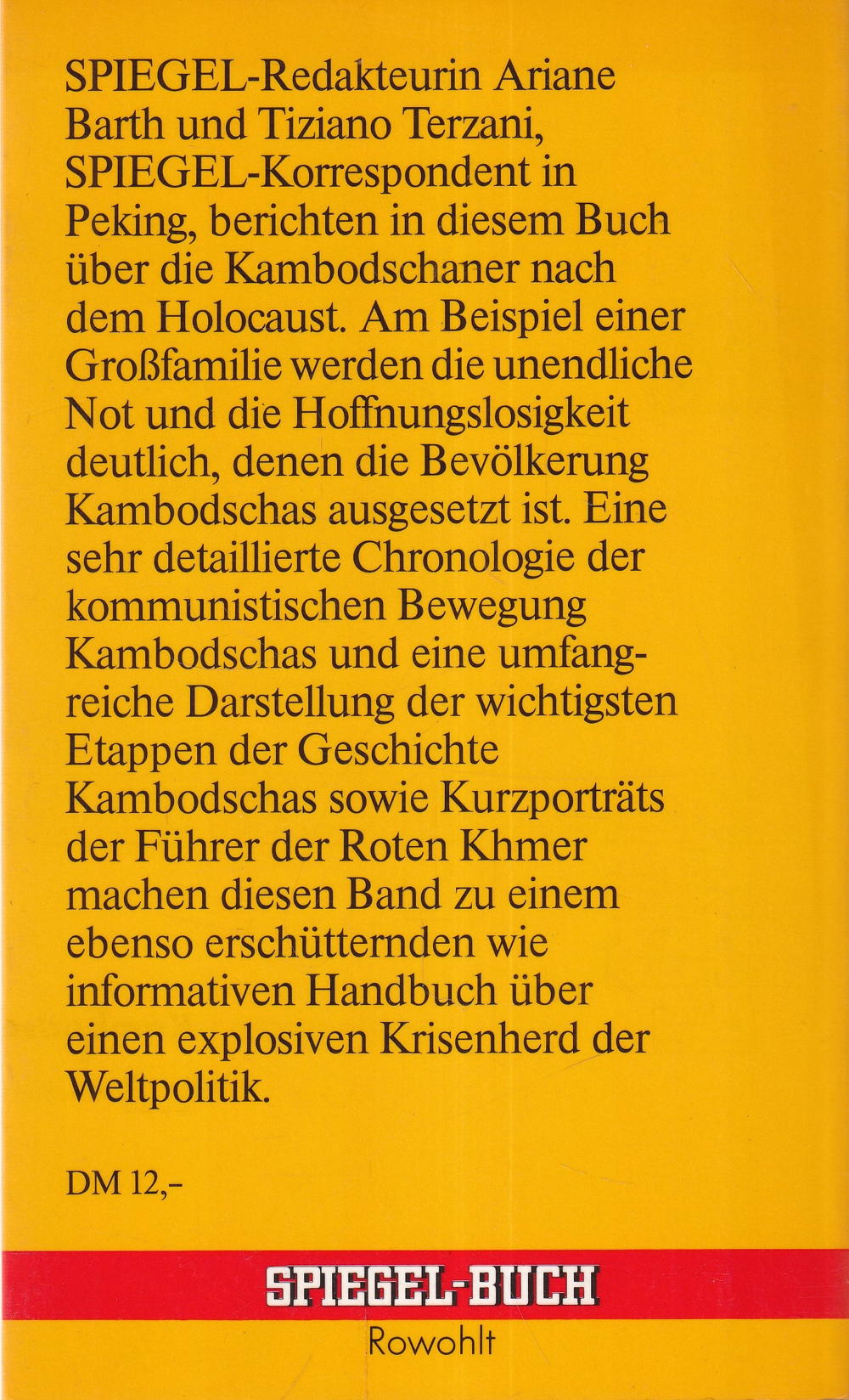 SPIEGEL-Redakteurin Ariane Barth und Tiziano Terzani, SPIEGEL-Korrespondent in Peking, berichten in diesem Buch über die Kambodschaner nach dem Holocaust. Am Beispiel einer Grossfamilie werden die unendliche Not und die Hoffnungslosigkeit deutlich, denen die Bevölkerung Kambodschas ausgesetzt ist. Eine sehr detaillierte Chronologie der kommunistischen Bewegung Kambodschas und eine umfangreiche Darstellung der wichtigsten Etappen der Geschichte Kambodschas sowie Kurzporträts der Führer der Roten Khmer machen diesen Band zu einem ebenso erschütternden wie informativen Handbuch über einen explosiven Krisenherd der Weltpolitik.
