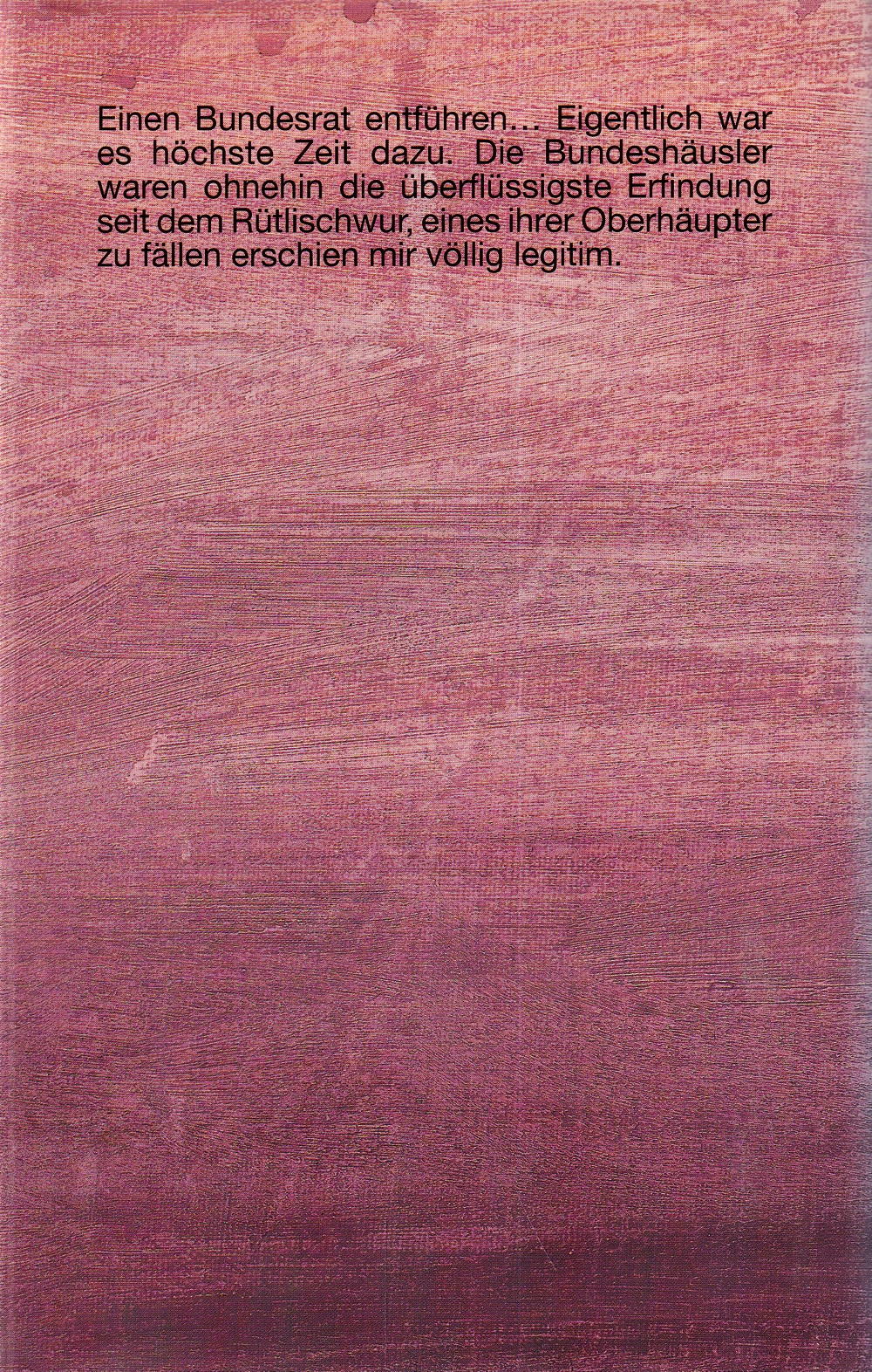 Einen Bundesrat entführen... Eigentlich war es höchste Zeit dazu. Die Bundeshäusler waren ohnehin die überflüssigste Erfindung seit dem Rütlischwur, eines ihrer Oberhäupter zu fällen erschien mir völlig legitim.